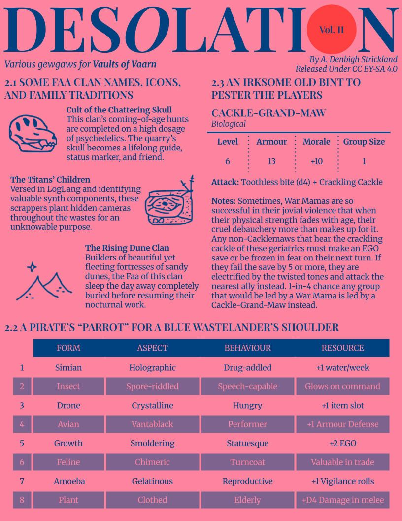 Desolation Vol. II is a small collection of supplemental material for use with Vaults of Vaarn RPG.